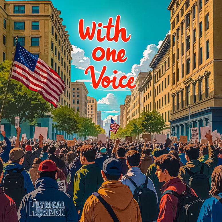 “With One Voice” is a passionate, contemporary protest anthem that evokes the spirit of unity and resistance in the face of rising authoritarianism. Rooted in specific historical references yet timeless in its tone, the song unfolds as a musical march for democracy, from Boston to Portland, from small-town streets to national capitals. It honors the sacrifices of past generations while calling on the current one to defend truth, justice, and liberty with nonviolent courage and collective resolve. The instrumental introduction sets a solemn but resolute tone. A lone saxophone opens, mournful and reflective, before the tempo builds with drums and a steel guitar, symbolizing the rising strength of a people coming together in purpose.